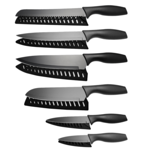 Couteaux de cuisine noirs à viande antiadhésifs avec couvercle, couteau de chef utilitaire Sashimi poignée en PP ensemble de couteaux en acier inoxydable