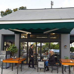 Auvent électrique avec cadre en aluminium blanc et auvent rétractable motorisé en acrylique pour l'extérieur, auvent à bras pliant pour patio